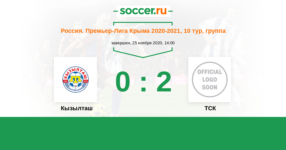 Россия. Премьер-Лига Крыма 07.10.2020 ТСК Логотип футбольный клуб ТСК (Симферополь) 0:1 Логотип футбольный клуб Кызылташ (Бахчисарай) Кызылташ
