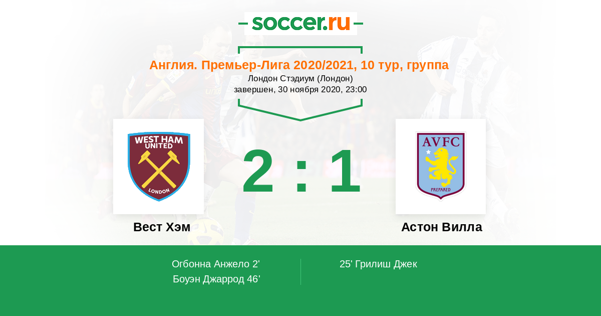 Протокол матча Вест Хэм против Астон Вилла