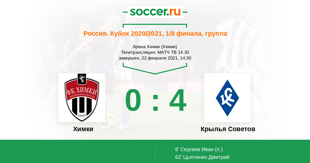 "Крылья Советов" довольно уверенно победили и шагнули в 1/4 КР, с чем болельщиков клуба и поздравляю. Самарская команда смотрелась очень неплохо и по движению, и по скорости, и по старанию играть в комбинационный футбол. Зиньковский хорош. Понятно конечно, что раннее удаление в составе "Химок" сыграло свою роль, но тем не менее. Ну а "Химки" оставшись так рано в меньшинстве, да еще и проигрывая в счете как-то совсем уж расклеились и бой дать не смогли. Как обычно личное мнение.