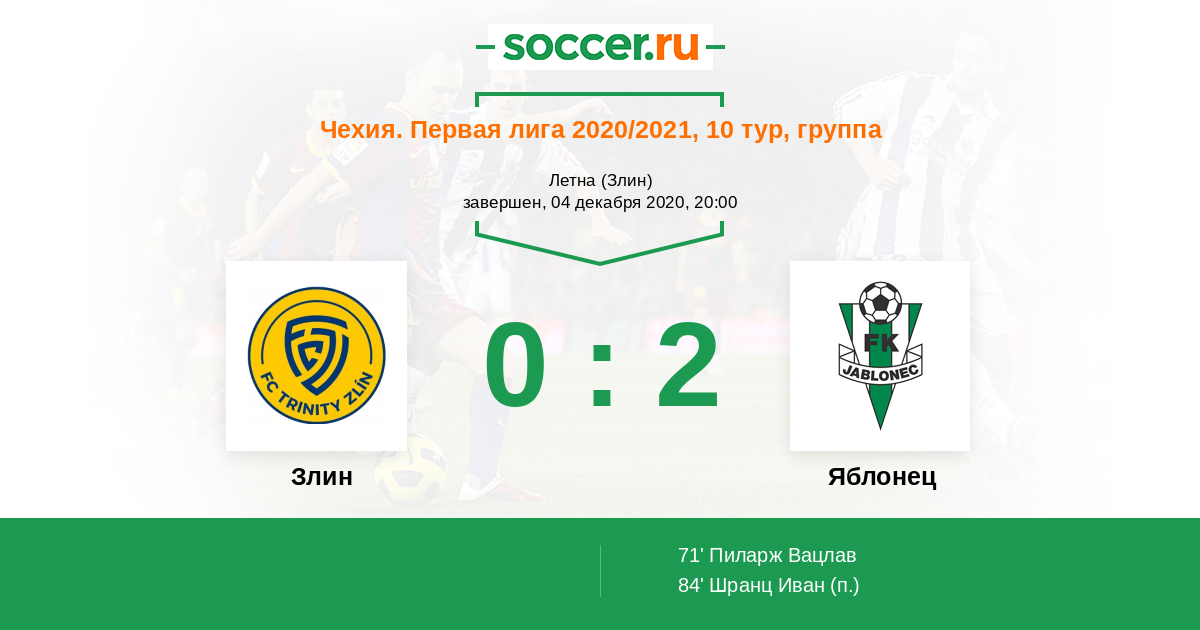 Протокол матча Злин против Яблонец