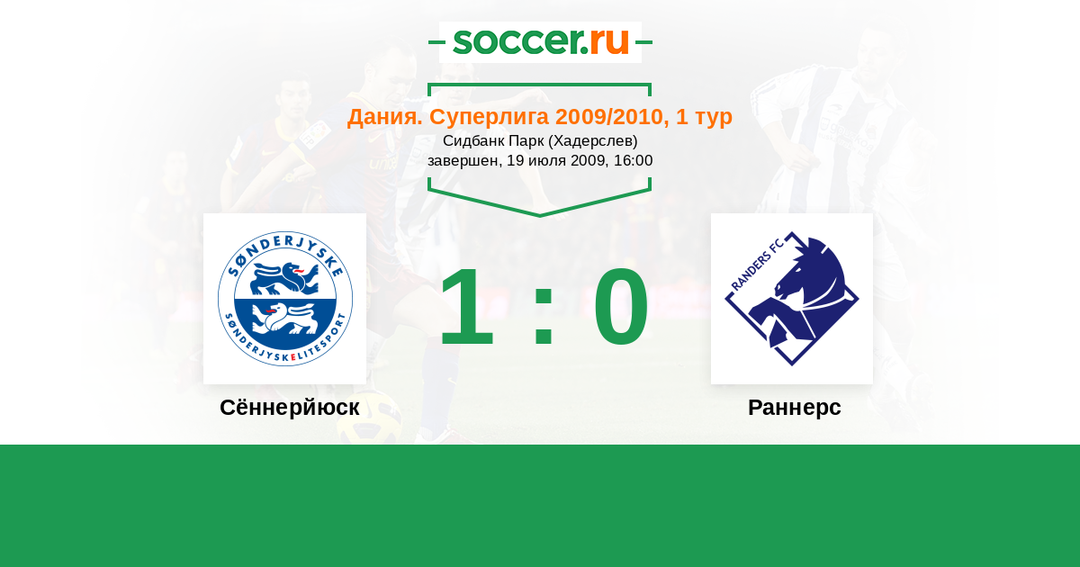 Дания. Суперлига 29.11.2009 Раннерс Логотип футбольный клуб Раннерс 0:0 Логотип футбольный клуб Сённерйюск (Хадерслев) Сённерйюск