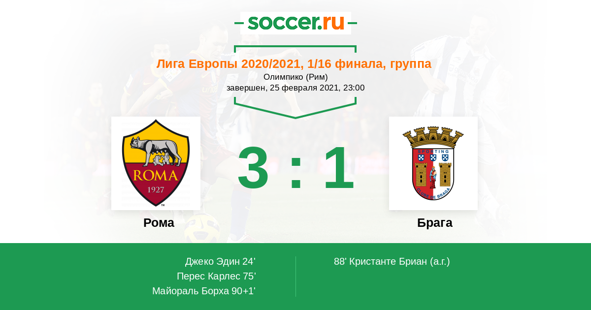 Протокол матча Рома против Брага
