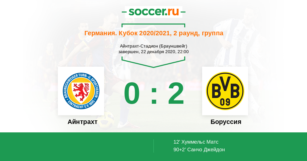 12' (0:1) Хуммельс Матс (15) (Санчо Джейдон (7))