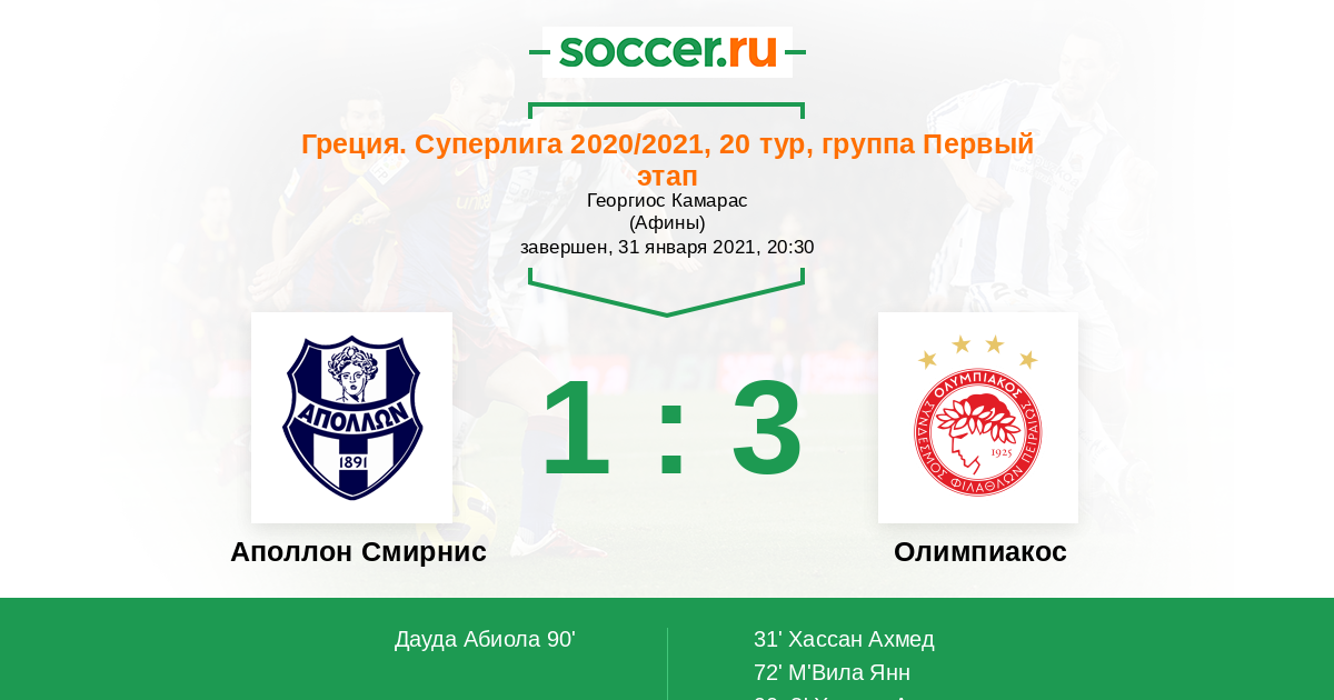 Протокол матча Аполлон Смирнис против Олимпиакос