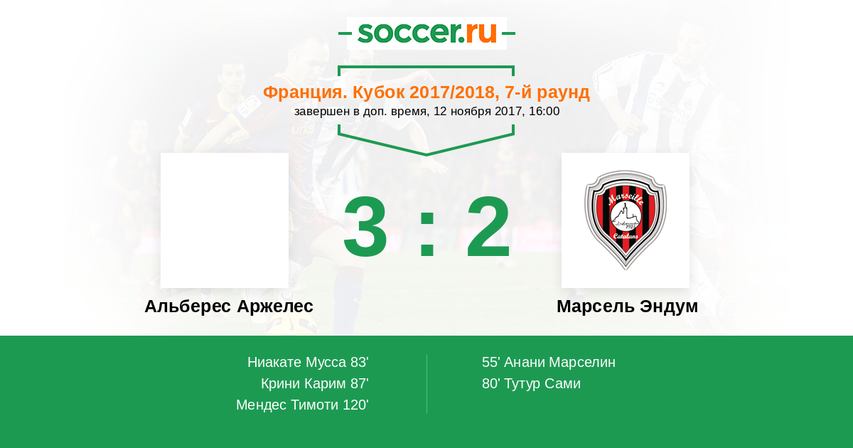 Протокол матча Альберес Аржелес против Марсель Эндум