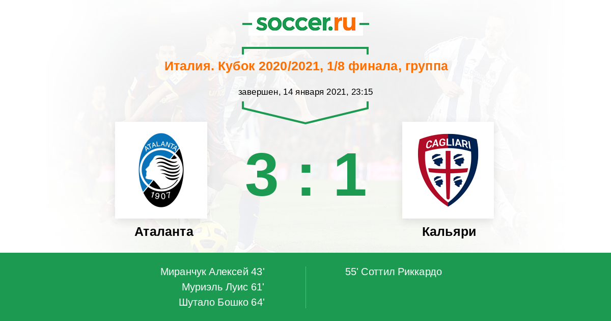 «Аталанта» одержала в рамках итальянского чемпионата три победы подряд, последовательно расправившись с «Сассуоло», «Пармой» и «Беневенто». Беспроигрышная серия «чёрно-синих» во всех турнирах достигла отметки в девять поединков: последнее поражение «Аталанта» потерпела в конце ноября от «Вероны». Увидим ли мы Алексея Миранчука? Ещё один интересный вопрос с непредсказуемым ответом. Если «Аталанта» поймает свою игру, то остановить её не представляется возможным. Тем более, если речь идёт о «Кальяри» – команде, которая стабильно проиграла все свои последние матчи. Ожидаем, что бергамаски пройдут в следующую стадию, причём сделают это в достаточно ярком стиле