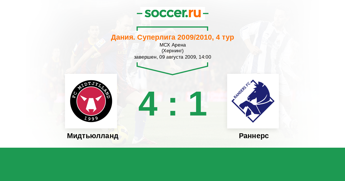 Дания. Суперлига 13.09.2010 Мидтьюлланд Логотип футбольный клуб Мидтьюлланд (Хернинг) 1:1 Логотип футбольный клуб Раннерс Раннерс
