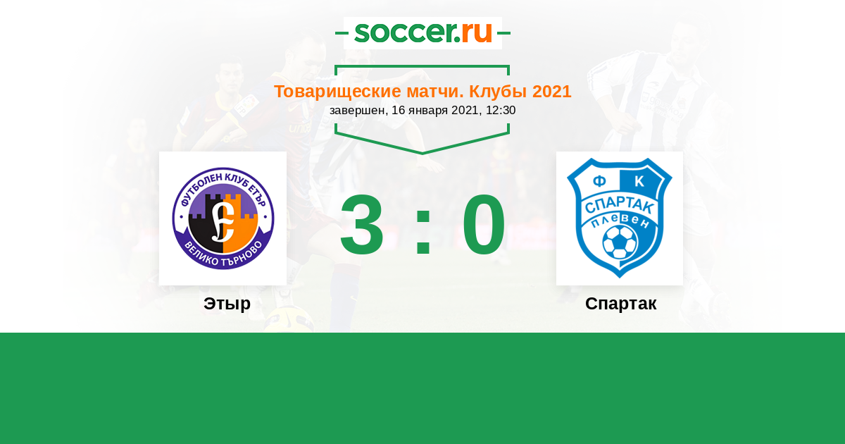 Товарищеские матчи. Клубы 13.01.2019 Этыр Логотип футбольный клуб Этыр (Велико-Тырново) 3:0 Логотип футбольный клуб Спартак (Плевен) Спартак