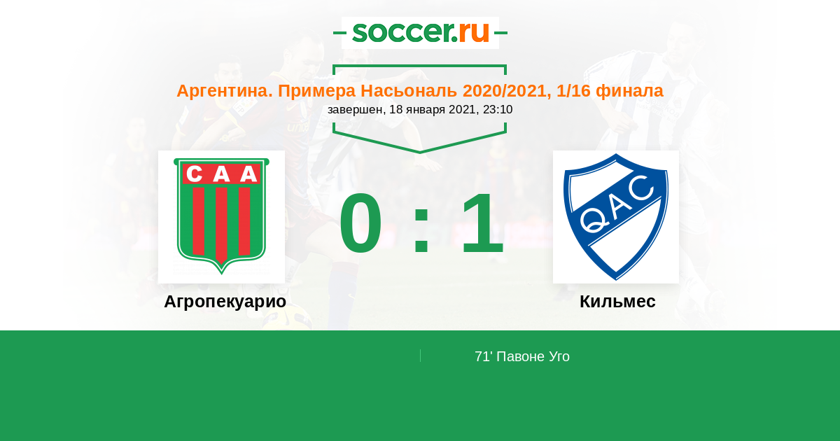Протокол матча Агропекуарио против Кильмес