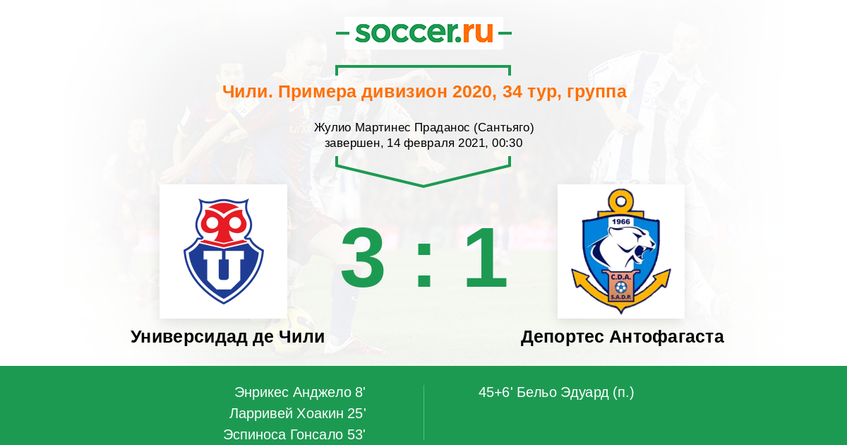 8' (1:0) Энрикес Анджело (9) (Контрерас Симон (31))
