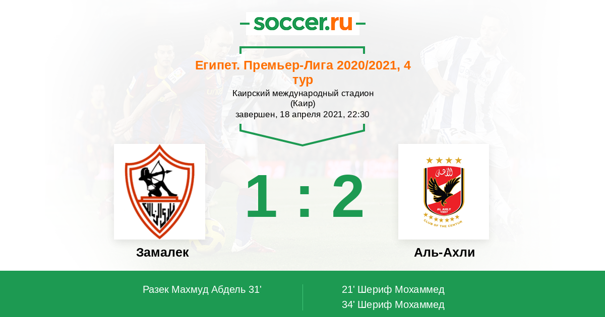 21' (0:1) Шериф Мохаммед (10) (Айман Ашраф (12))