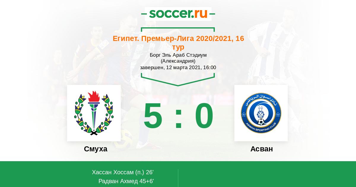45+6' (2:0) Радван Ахмед (99) (Фати Мостафа (30))