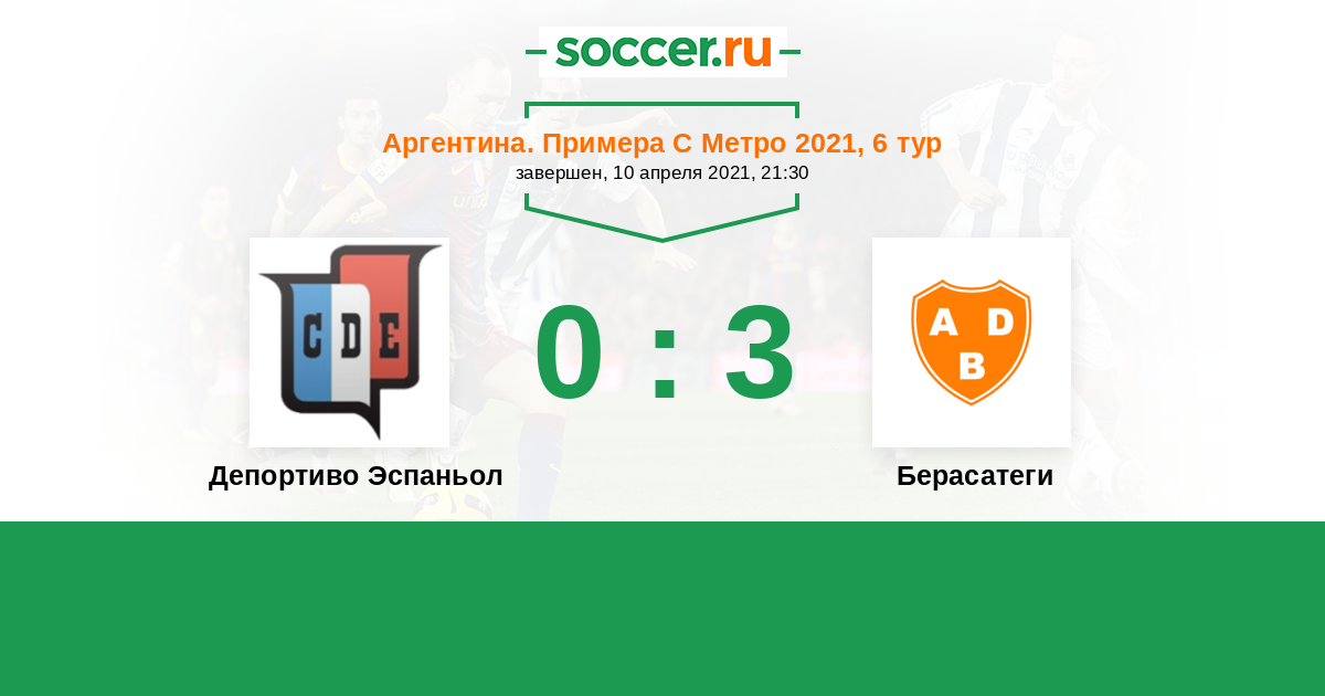 Аргентина. Примера С Метро 21.04.2023 Берасатеги Логотип футбольный клуб Берасатеги (Буэнос-Айрес) 2:0 Логотип футбольный клуб Депортиво Эспаньол (Буэнос-Айрес) Депортиво Эспаньол