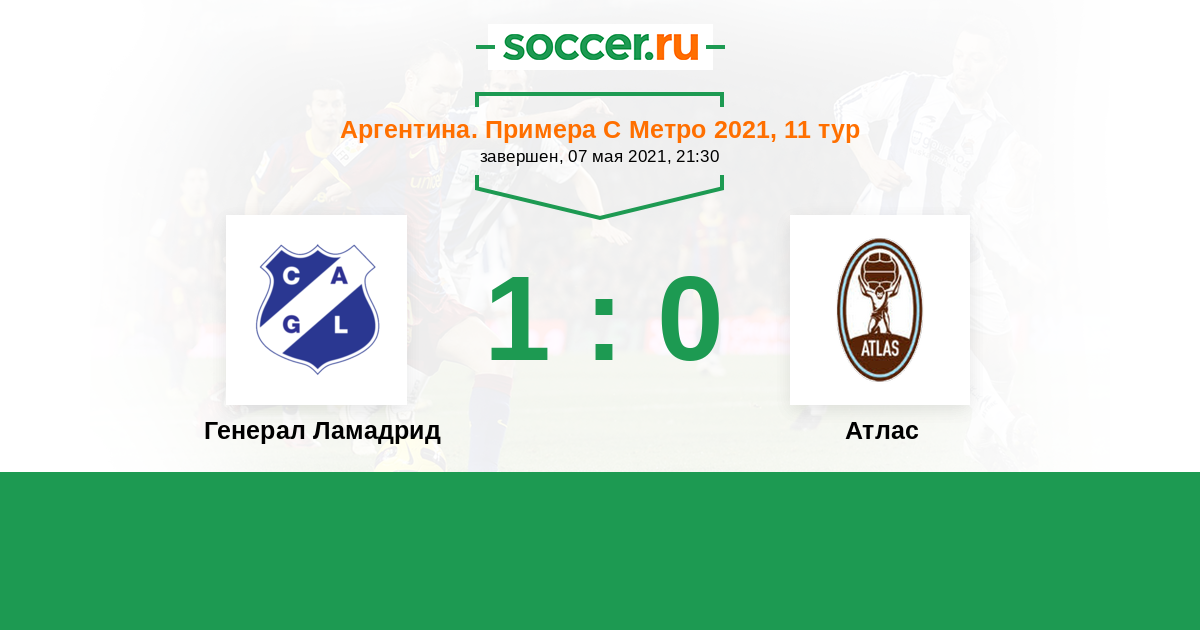 Аргентина. Примера С Метро 26.09.2021 Атлас Логотип футбольный клуб Атлас (Хенераль Родригес) 1:1 Логотип Генерал Ламадрид (Буэнос-Айрес) Генерал Ламадрид