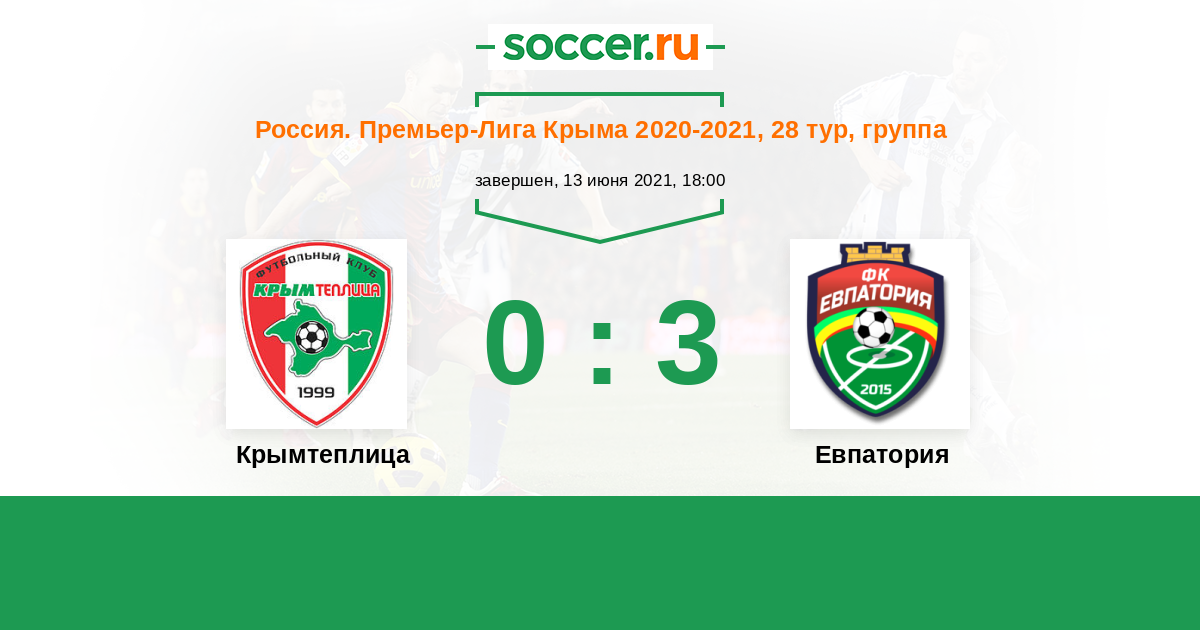 Россия. Премьер-Лига Крыма 13.06.2021 Крымтеплица Логотип футбольный клуб Крымтеплица (Молодежное) 0:3 Логотип футбольный клуб Евпатория Евпатория