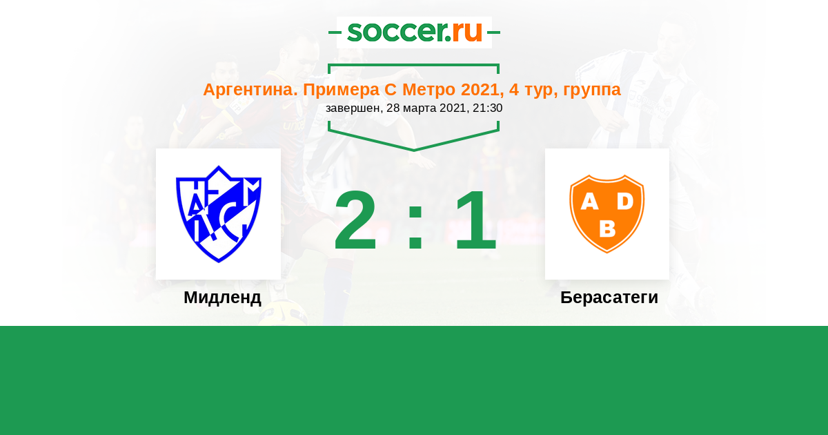 Аргентина. Примера С Метро 21.07.2015 Берасатеги Логотип футбольный клуб Берасатеги (Буэнос-Айрес) 1:1 Логотип футбольный клуб Мидленд (Либертад) Мидленд