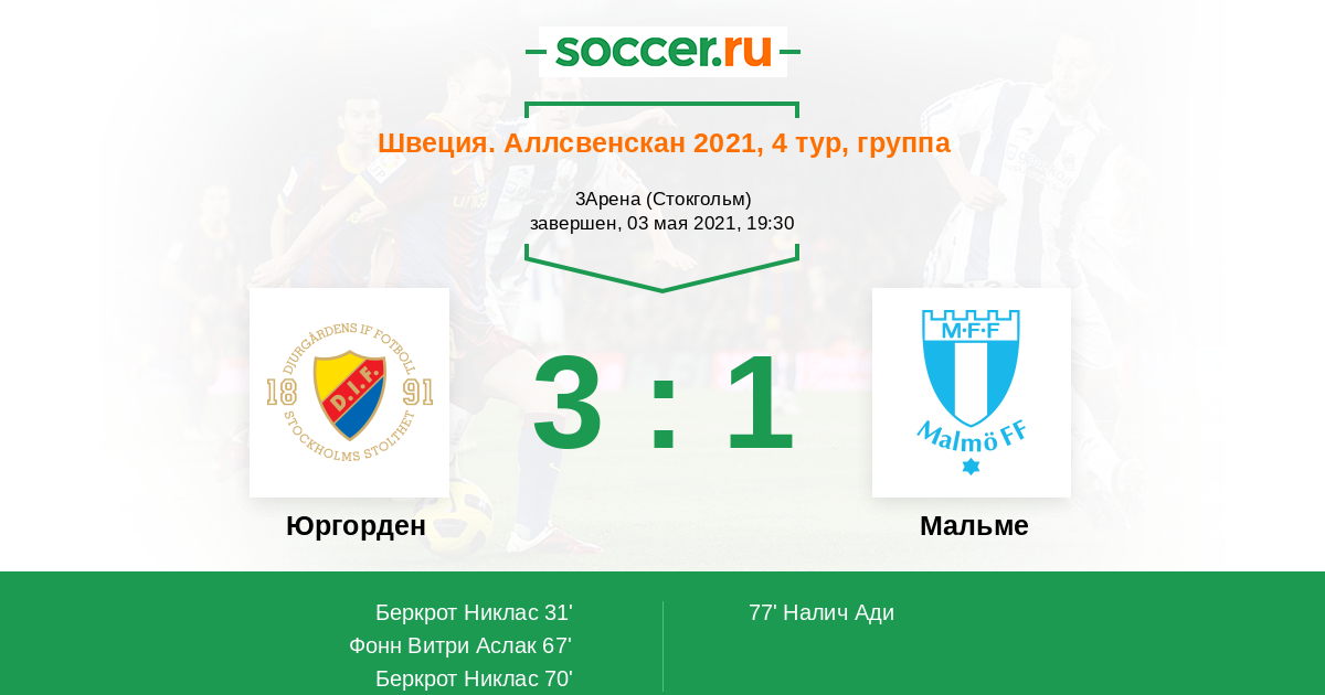 31' (1:0) Беркрот Никлас (19) (Эрикссон Магнус (7))