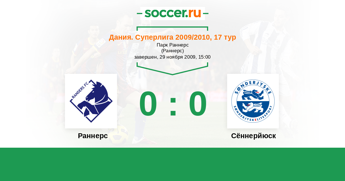 Дания. Суперлига 29.08.2010 Раннерс Логотип футбольный клуб Раннерс 0:0 Логотип футбольный клуб Сённерйюск (Хадерслев) Сённерйюск