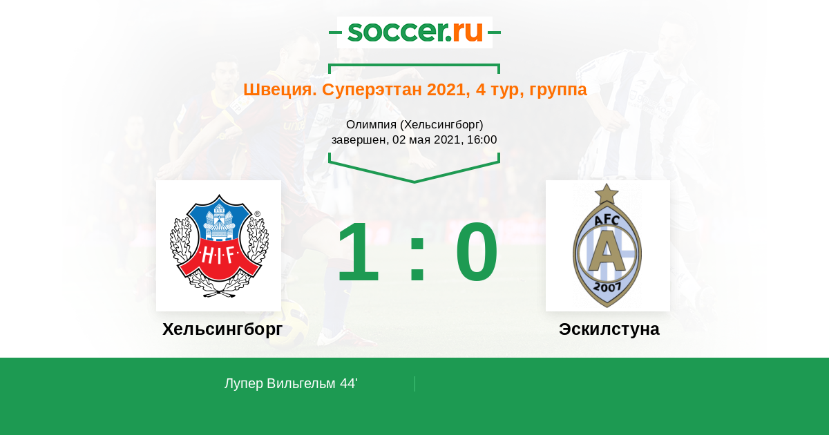 44' (1:0) Лупер Вильгельм (13) (Лундберг Виктор (7))
