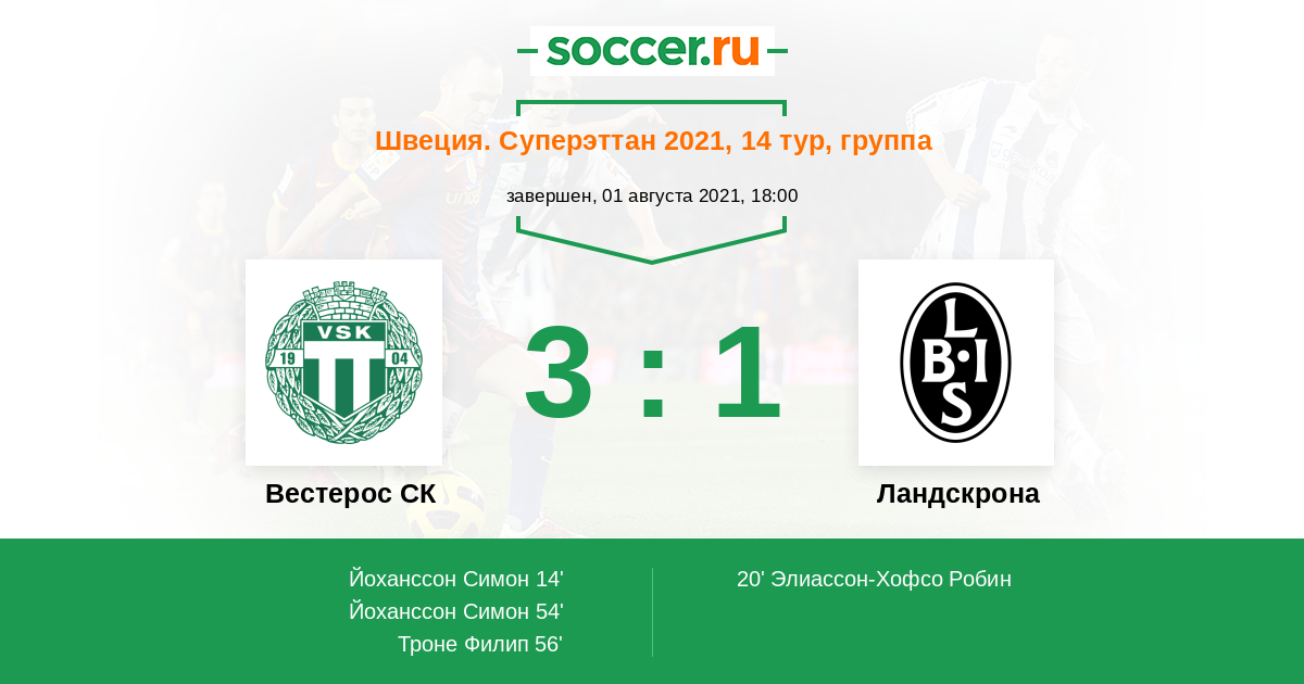 14' (1:0) Йоханссон Симон (6) (Споррног Альбин (31))