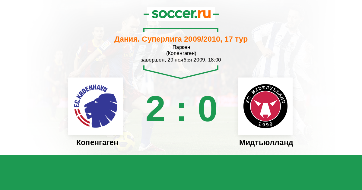 Дания. Суперлига 17.04.2010 Мидтьюлланд Логотип футбольный клуб Мидтьюлланд (Хернинг) 3:2 Логотип футбольный клуб Копенгаген Копенгаген