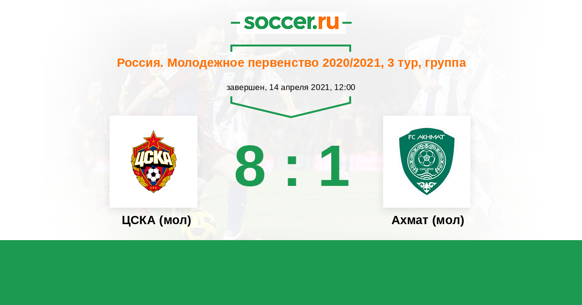 Россия. Премьер-Лига U21 24.08.2019 ЦСКА (мол) Логотип футбольный клуб ЦСКА (мол) (Москва) 1:0 Логотип футбольный клуб Ахмат (мол) (Грозный) Ахмат (мол)
