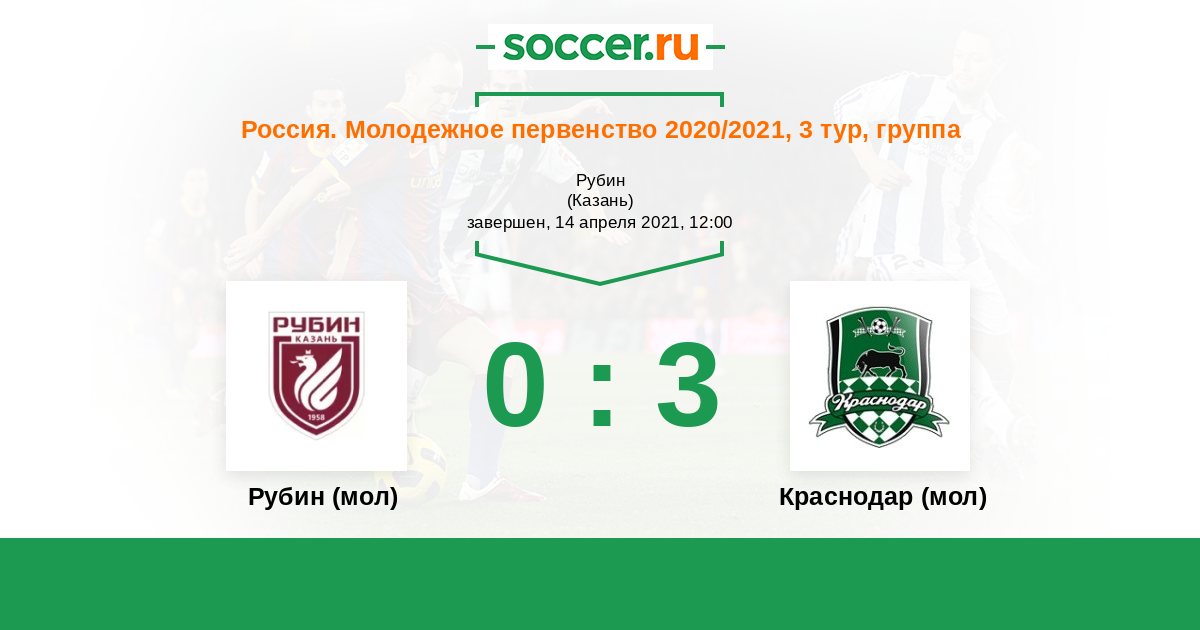 Россия. Премьер-Лига U21 07.04.2015 Рубин (мол) Логотип футбольный клуб Рубин (мол) (Казань) 1:1 Логотип футбольный клуб Краснодар (мол) Краснодар (мол)
