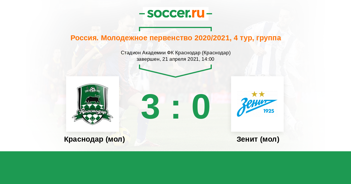 Россия. Премьер-Лига U21 30.04.2011 Краснодар (мол) Логотип футбольный клуб Краснодар (мол) 3:1 Логотип футбольный клуб Зенит (мол) (Санкт-Петербург) Зенит (мол)