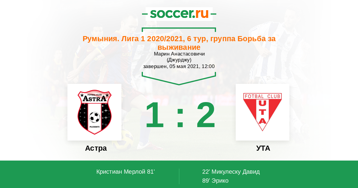 89' (1:2) Эрико (21) (Басти Сорин (22))