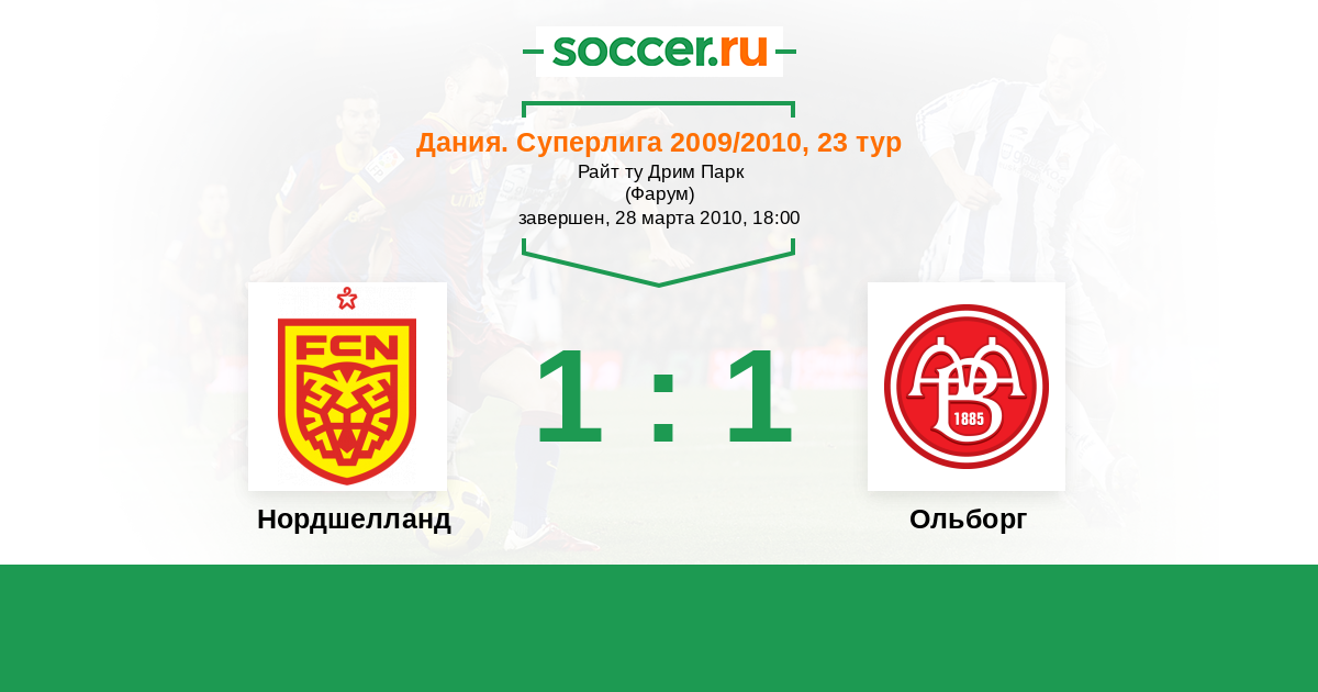 Дания. Суперлига 27.03.2010 Нордшелланд Логотип футбольный клуб Нордшелланд (Фарум) 1:1 Логотип футбольный клуб Ольборг Ольборг