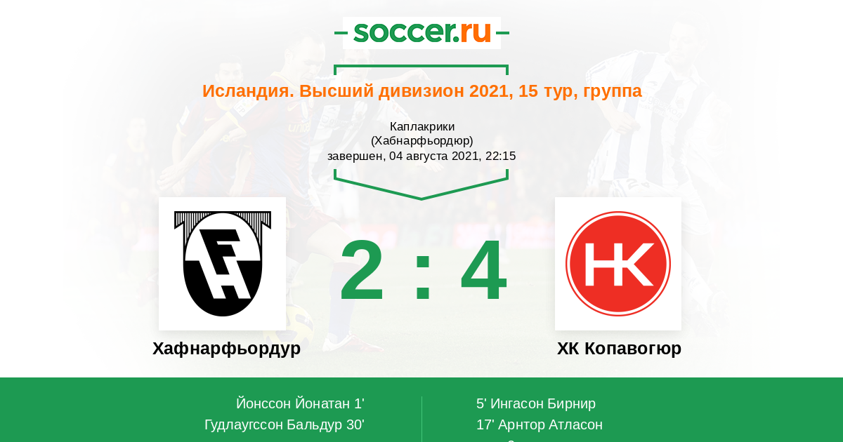 53' (2:4) Арнарсон Атли (18) (Йонссон Биркир Валур (6))