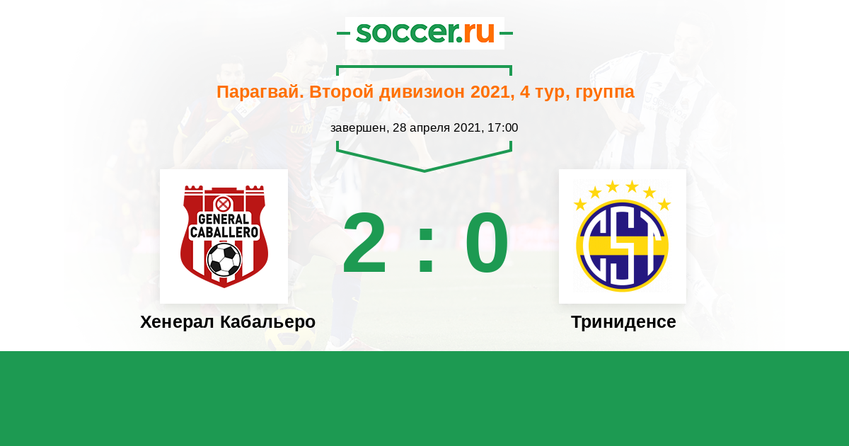 Парагвай. Второй дивизион 31.07.2021 Триниденсе Логотип футбольный клуб Триниденсе (Асунсьон) 1:0 Логотип футбольный клуб Хенерал Кабальеро (Доктор-Хуан-Леон-Майоркин) Хенерал Кабальеро