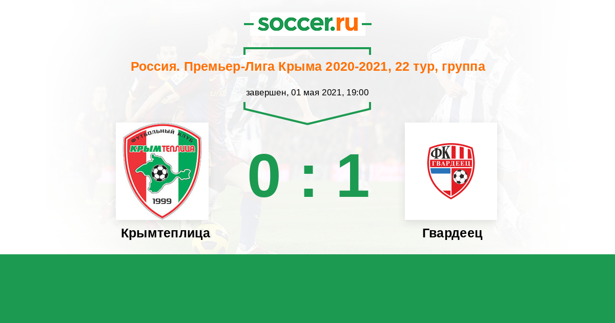 Россия. Премьер-Лига Крыма 01.05.2021 Крымтеплица Логотип футбольный клуб Крымтеплица (Молодежное) 0:1 Логотип футбольный клуб Гвардеец (Аграрное) Гвардеец