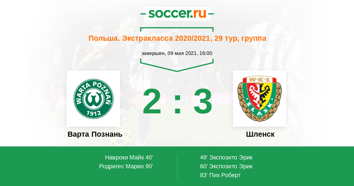 Протокол матча Варта Познань против Шленск
