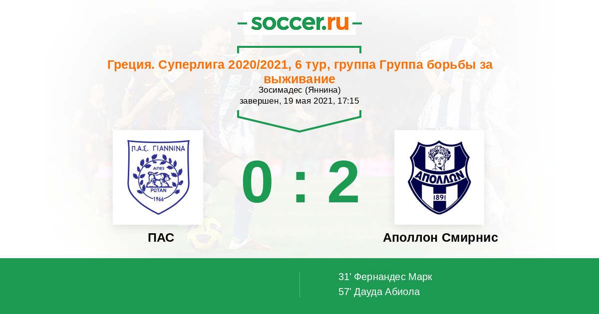 Протокол матча ПАС против Аполлон Смирнис