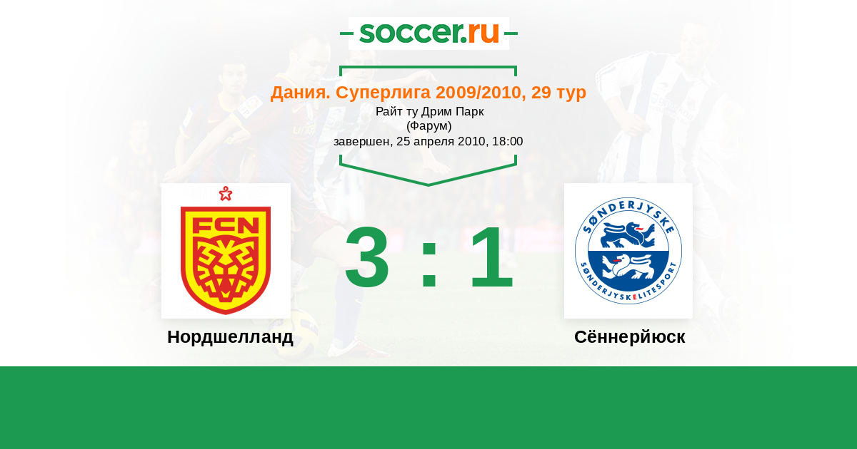 Дания. Суперлига 08.11.2009 Сённерйюск Логотип футбольный клуб Сённерйюск (Хадерслев) 0:1 Логотип футбольный клуб Нордшелланд (Фарум) Нордшелланд