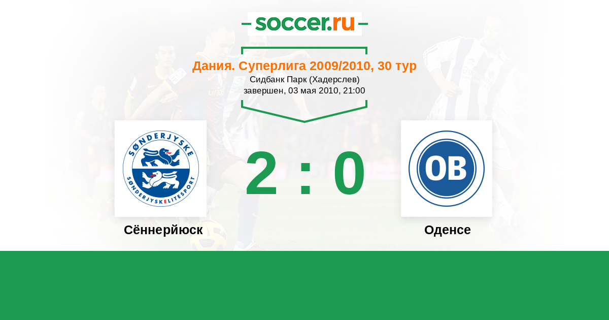Дания. Суперлига 16.05.2009 Сённерйюск Логотип футбольный клуб Сённерйюск (Хадерслев) 1:1 Логотип футбольный клуб Оденсе Оденсе