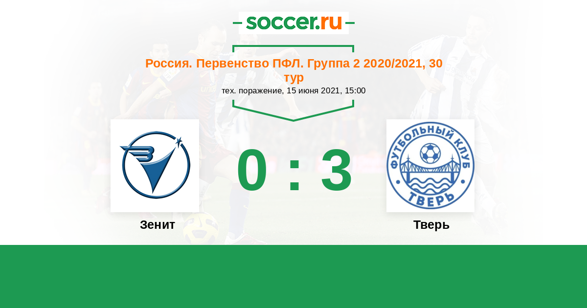 Россия. Вторая лига. Группа 2 15.06.2021 Зенит Логотип футбольный клуб Зенит (Иркутск) 0:3 Логотип футбольный клуб Тверь Тверь