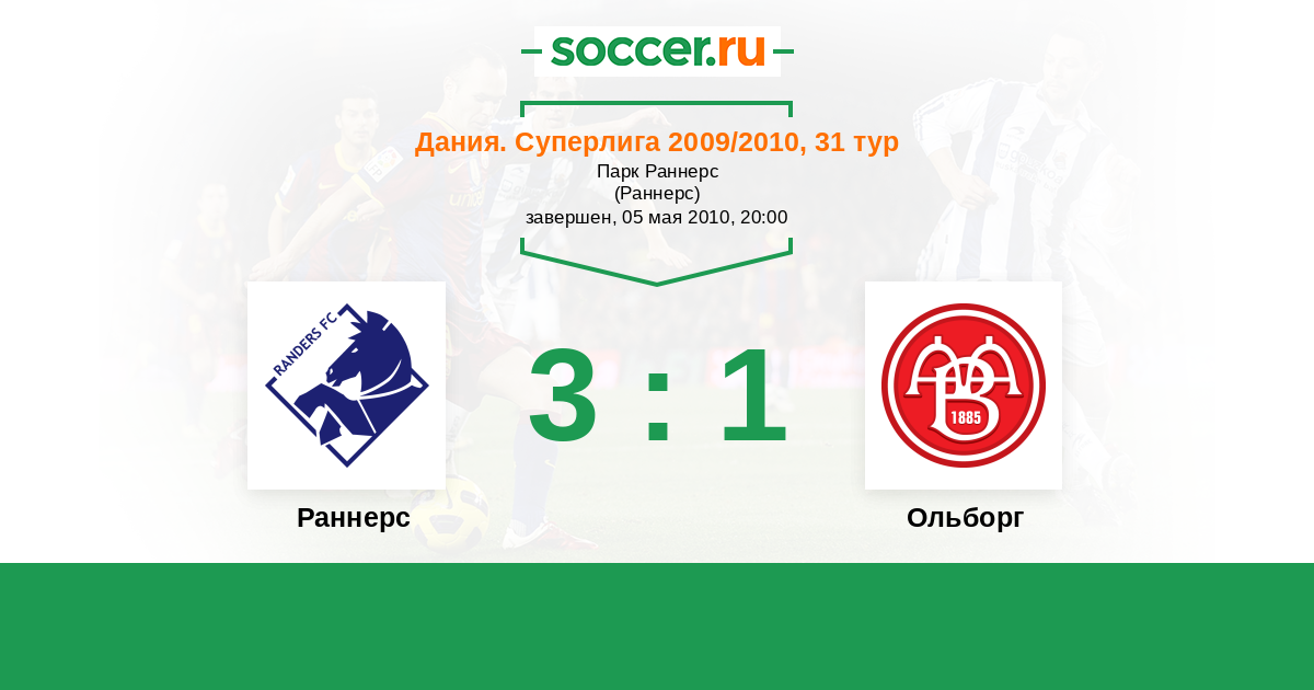 Дания. Суперлига 18.09.2010 Раннерс Логотип футбольный клуб Раннерс 2:3 Логотип футбольный клуб Ольборг Ольборг