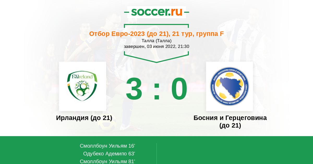 Протокол матча Ирландия (до 21) против Босния и Герцеговина (до 21)