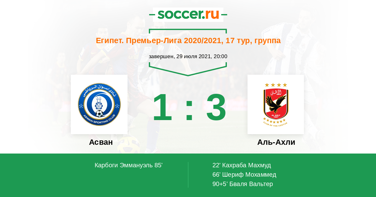 Протокол матча Асван против Аль-Ахли