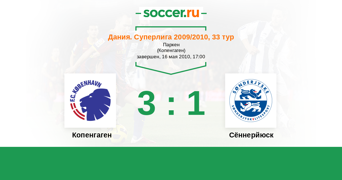 Дания. Суперлига 18.07.2010 Сённерйюск Логотип футбольный клуб Сённерйюск (Хадерслев) 1:3 Логотип футбольный клуб Копенгаген Копенгаген