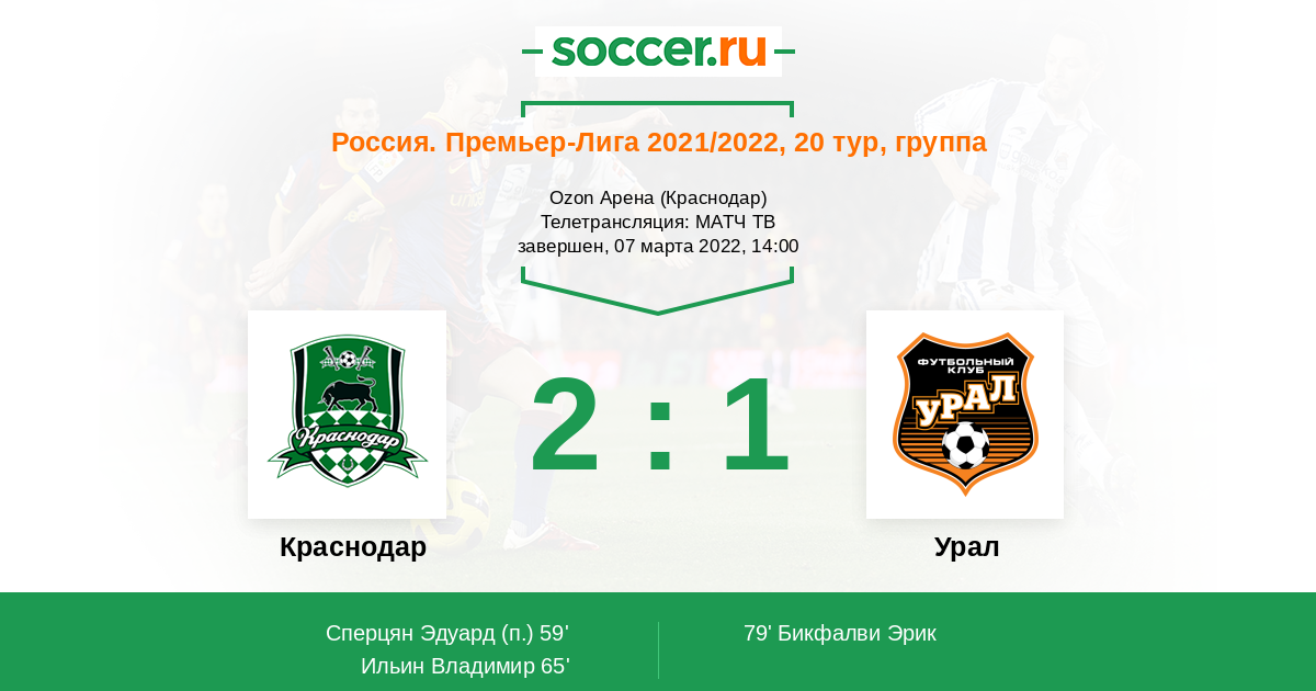 «Краснодар» стал другой командой за зиму. Главный тренер теперь — неопытный Алексей Антонюк. Официальных игр после перерыва не было, с составом проблемы, клуб выглядит крайне непредсказуемо. «Урал» может похвастаться крепкой обороной, но с результативностью испытывает проблемы. Игорь Шалимов использует схему с пятью защитниками, потому рассчитывать на результативный исход не приходится.