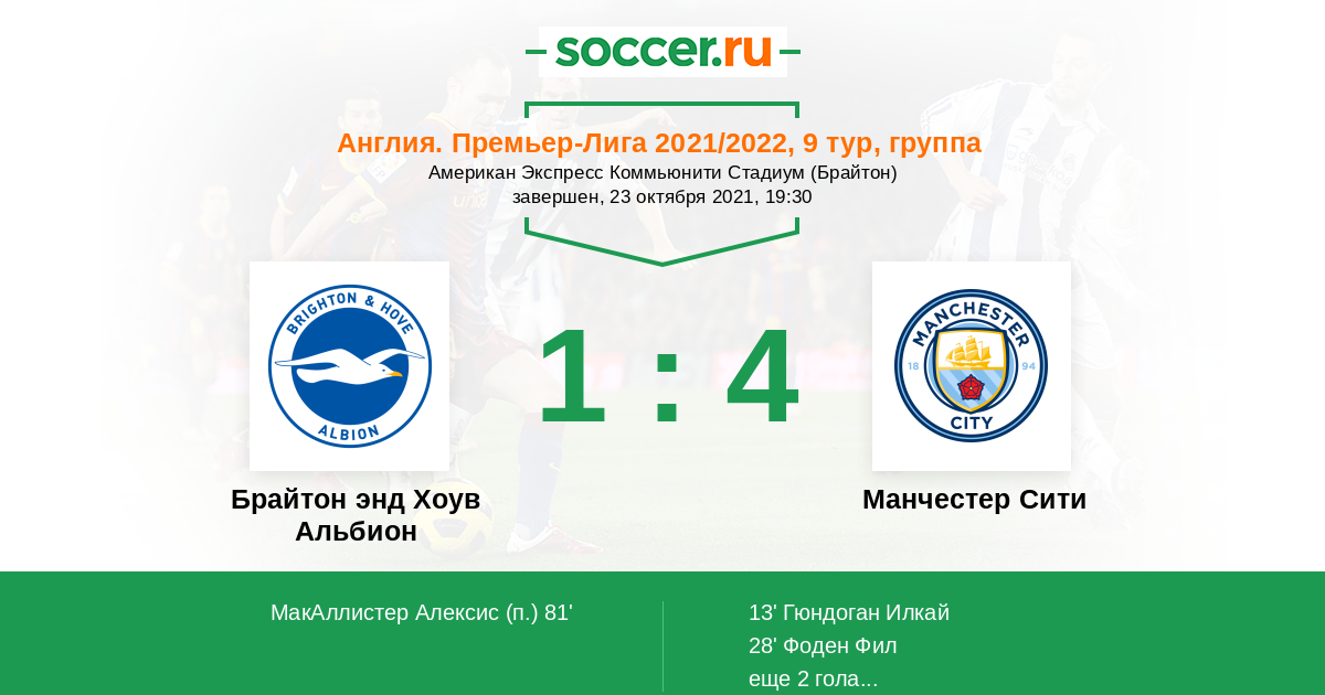 "Манчестер Сити" остается в отличной форме. После ничьи с "Ливерпулем" команда Гвардиолы выиграла 2:0 у "Бернли" и разгромила 5:1 "Брюгге" в Лиге чемпионов. Как бы ни прогрессировал "Брайтон", тем не менее, у команды по-прежнему страдает реализация. Что и вылилось в потерю очков в последних трех турах. И, если в этих трех матчах удалось избежать поражений, то команда уровня "Манчестер Сити" никаких поблажек не даст. А значит, хозяев ждет второе поражение в чемпионате.