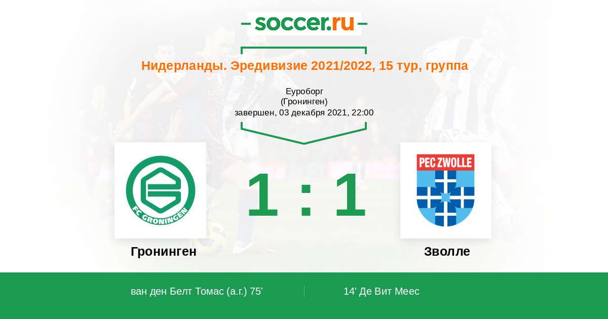 75' (1:1) Автогол ван ден Белт Томас (20)