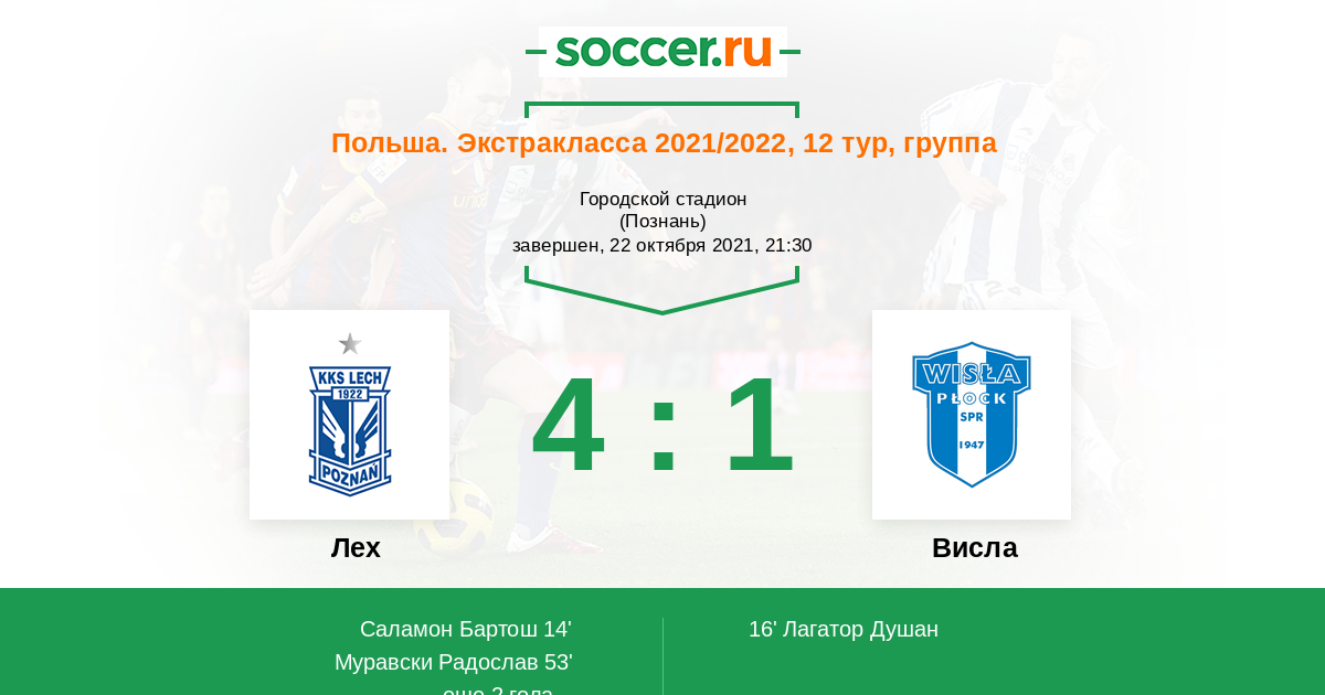Очные противостояния этих двух команд на поле Леха всегда заканчиваются результативно – 4 последние игры с 3 и более забитыми. Сейчас же Лех ещё сильней, чем в том же прошлом сезоне, гол от Плоцка также можно ожидать. Ведь гостей подводит только оборона, линия атаки справляется со своими функциями и входит в топ-4 среди команд лиги по забитым мячам. Ждем результативного матча.