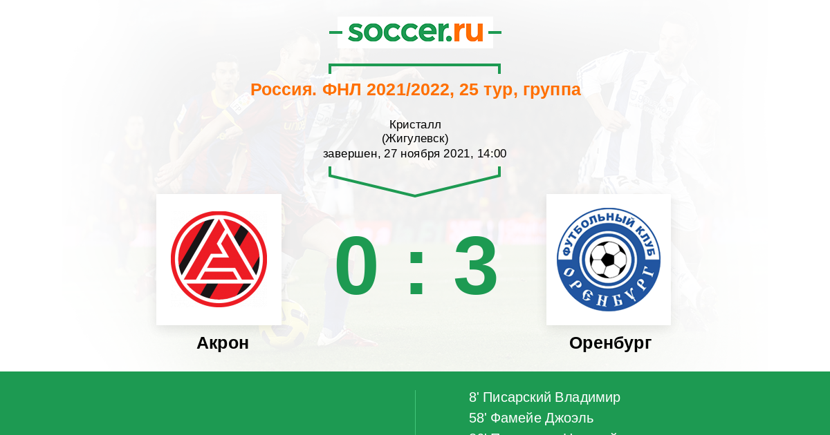 Я думаю что в этом противостоянии явного фаворита нет. Акрон очень здорово играет у себя в родных стенах и одержал победы над лидерами Торпедо Факелом и Аланией. А вот у Оренбурга на выезде не всё так гладко получается.