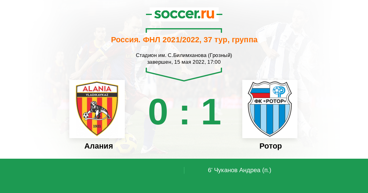 Я думаю что в этом противостоянии более чем явным фаворитом на победу является команда хозяев поля Алания . Команда гостей Ротор уже вылетела в ФНЛ 2 и наврядли у неё найдётся мотивация, чтобы противостоять команде хозяев поля.