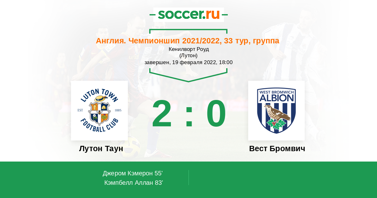 Протокол матча Лутон Таун против Вест Бромвич