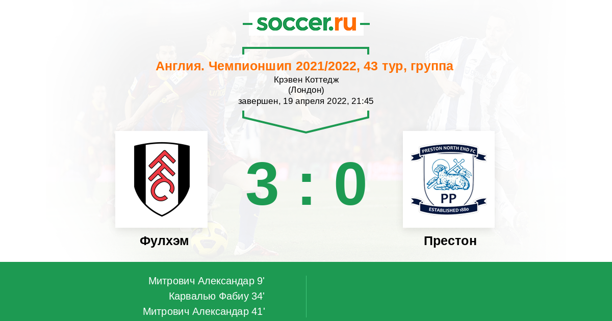 Впереди у Фулхэма игра с Борнмутом. Теоретически, "дачники" еще могут потерять первую строчку. На практике же... Ну не должно у хозяев возникнуть проблем с Престоном. Играет коллектив одинаково хорошо дома и на выезде, наколотил столько что диву даешься. Пожалуй, эта встреча должна пройти по совершенно другому сценарию, нежели матч с Ковентри Сити. Как минимум Два гола "дачников"? Их можно забить уже по истечении первой половины поединка.